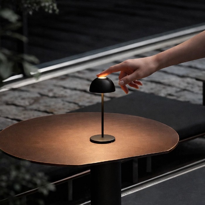 Lámpara de exterior e interior inalámbrica realizada en aluminio. Dimerizable que brinda una opción versátil y fincional. Botón táctil que permite regular la intensidad de la luz. Autonomía propia. Carga mediante USB. IP44