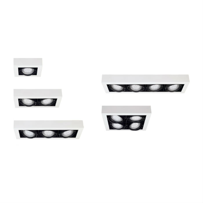 Plafón cardánico con pivotes móviles. Reflector óptico en lámpara. Cuerpo de acero y aros de aluminio inyectado. Luz directa y simétrica. IP 20.
