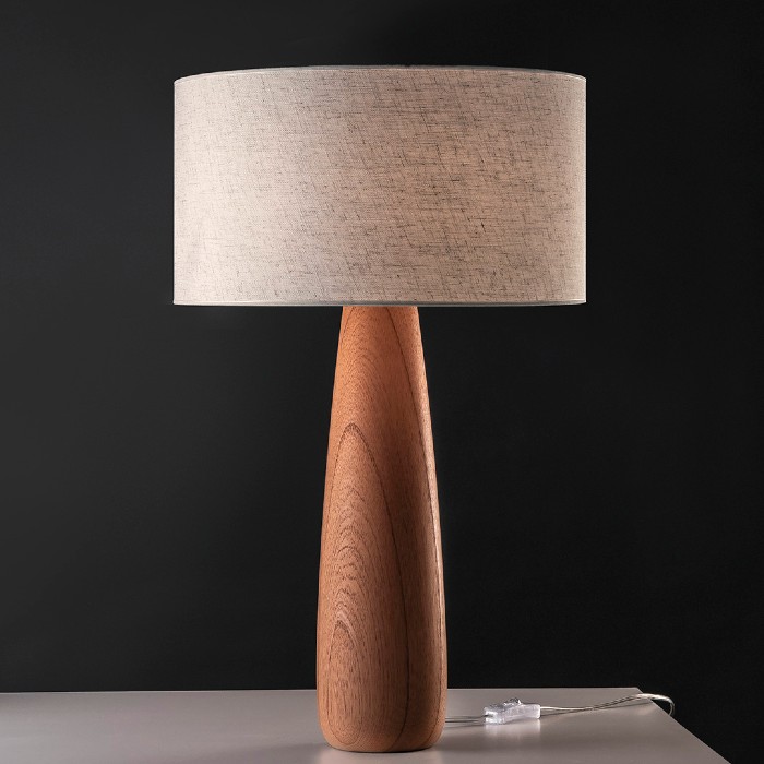 Lámpara de mesa con pantalla de tela (a elección) y base de madera de Cedro. APTA LED.
