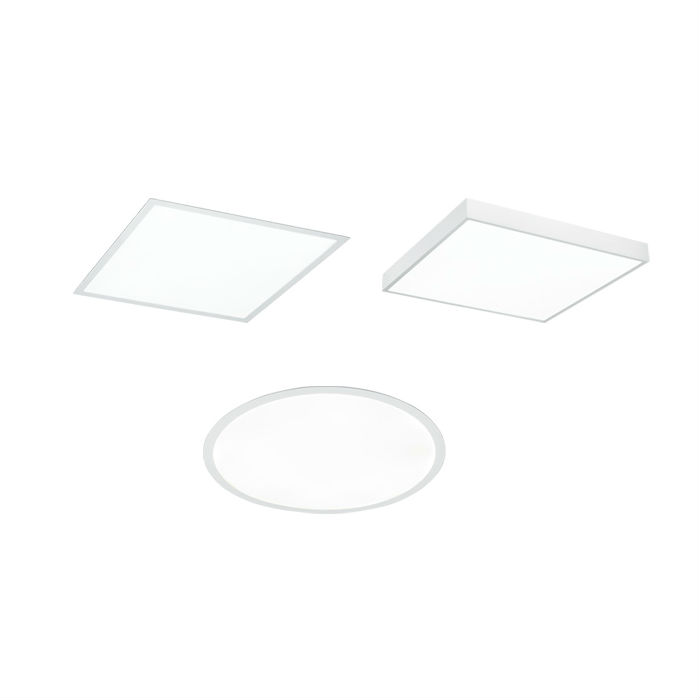Plafón de techo flat cuadrado de leds de aluminio inyectado. Difusor de policarbonato opal. Distribución de luz directa y simétrica. IP 44. Opcional Dimerizable.