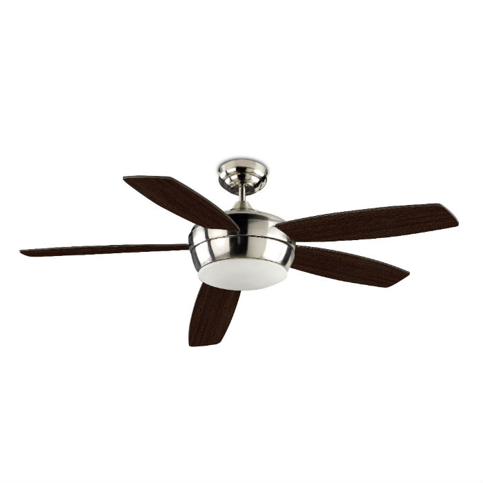 Ventilador de techo de cinco aspas reversibles de madera y tulipa de cristal opal satinado. Incluye mando a distancia.