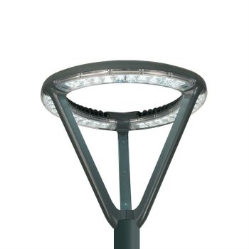 Farola de led, cuerpo de aluminio inyectado, base y columna de acero y difusor de policarbonato transparente. Distribución difusa y simétrica. IP 55.