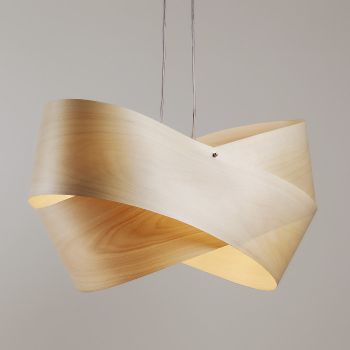 Colgante de diseño construída con chapa natural de madera de Sabugueiro. El tratamiento de la madera se realiza con una resina especial logrando que el material no se reseque con el paso del tiempo y tenga elasticidad para lograr las formas deseadas. El efecto lumínico proyecta la belleza interna de la madera irradiando una calidez especial. Resistente al calor de las lámparas y dejan pasar perfectamente la luz.