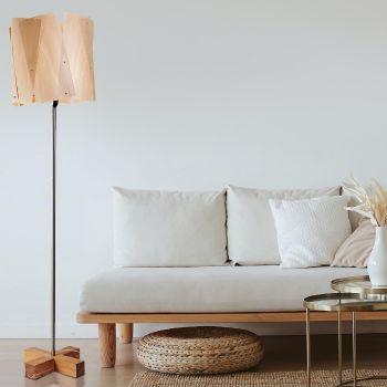 Lámpara de pie construída en chapa natural de madera de Sabugueiro. El tratamiento de la madera se realiza con una resina especial logrando que el material no se reseque con el paso del tiempo y tenga elasticidad para lograr las formas deseadas. El efecto lumínico proyecta la belleza interna de la madera irradiando una calidez especial. Resistente al calor de las lámparas y dejan pasar perfectamente la luz.
