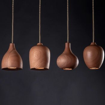 Colgante de diseño de madera de Cedro torneada de forma artesanal. Cable textil de 2 mts. cada luminaria. Barral blanco de 90cm.