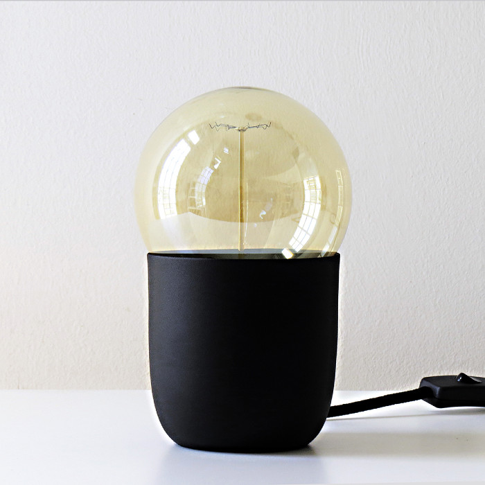 Velador de mesa individual negro texturado. Pintura epoxi al horno. Cable textil.