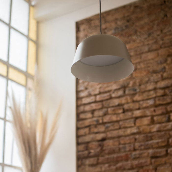 Colgante de diseño de aluminio con interior blanco tensor y cable textil. Difusor de acrílico. Disponible para dos colgante con base.
