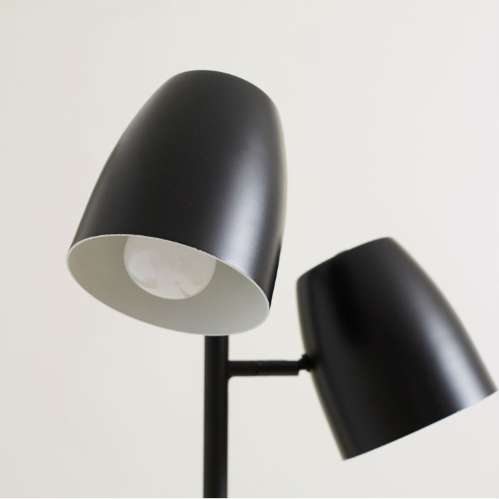 Lámpara de pie de hierro y aluminio con cabezal doble móvil.