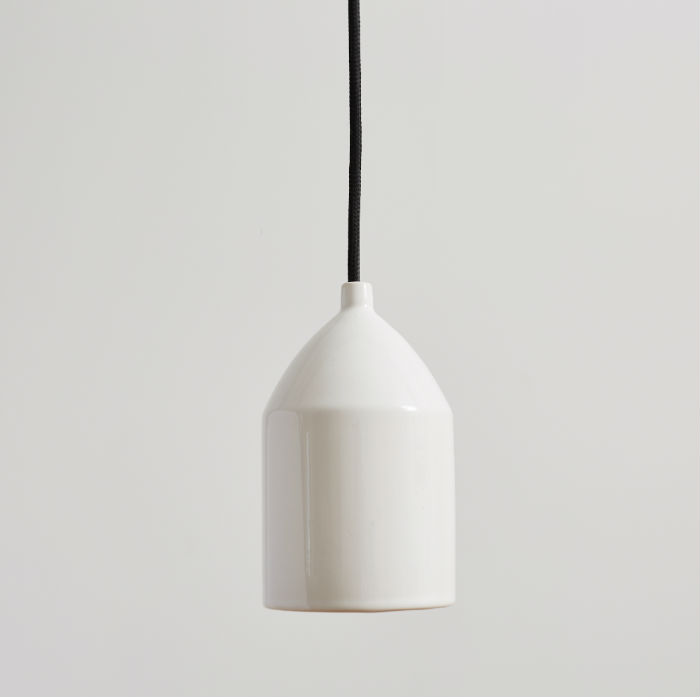 Colgante de diseño de cerámica esmaltada en Blanco, Gris, verde. Cablede tela negra de un metro. Florón Blanco metálico.