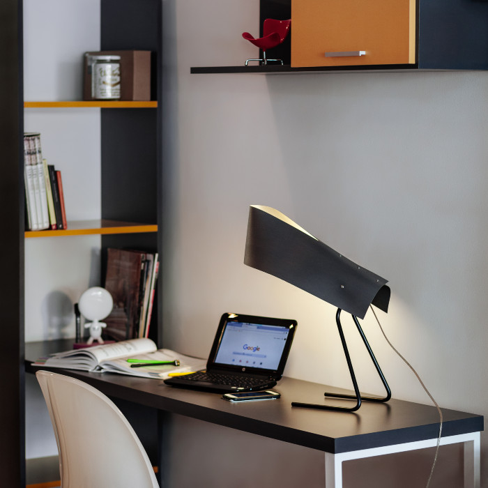 Lámapra de mesa construída en chapa natural de madera de Sabugueiro. El tratamiento de la madera se realiza con una resina especial logrando que el material no se reseque con el paso del tiempo y tenga elasticidad para lograr las formas deseadas. El efecto lumínico proyecta la belleza interna de la madera irradiando una calidez especial. Resistente al calor de las lámparas y dejan pasar perfectamente la luz.